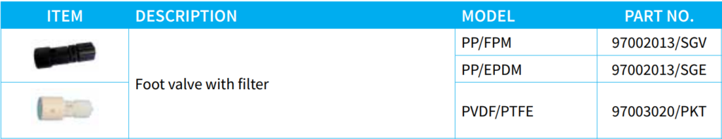 Kimyasallara son derece dayanıklı PVDF malzemeden üretilmiştir. Dozaj tankı gibi bir kimyasal kabın içine kalıcı olarak daldırılmak üzere tasarlanmıştır. Dozaj pompasına bağlantı, dozaj borusunun üzerine sıkıca kapatılarak dozaj pompasına bir rota sağlar.